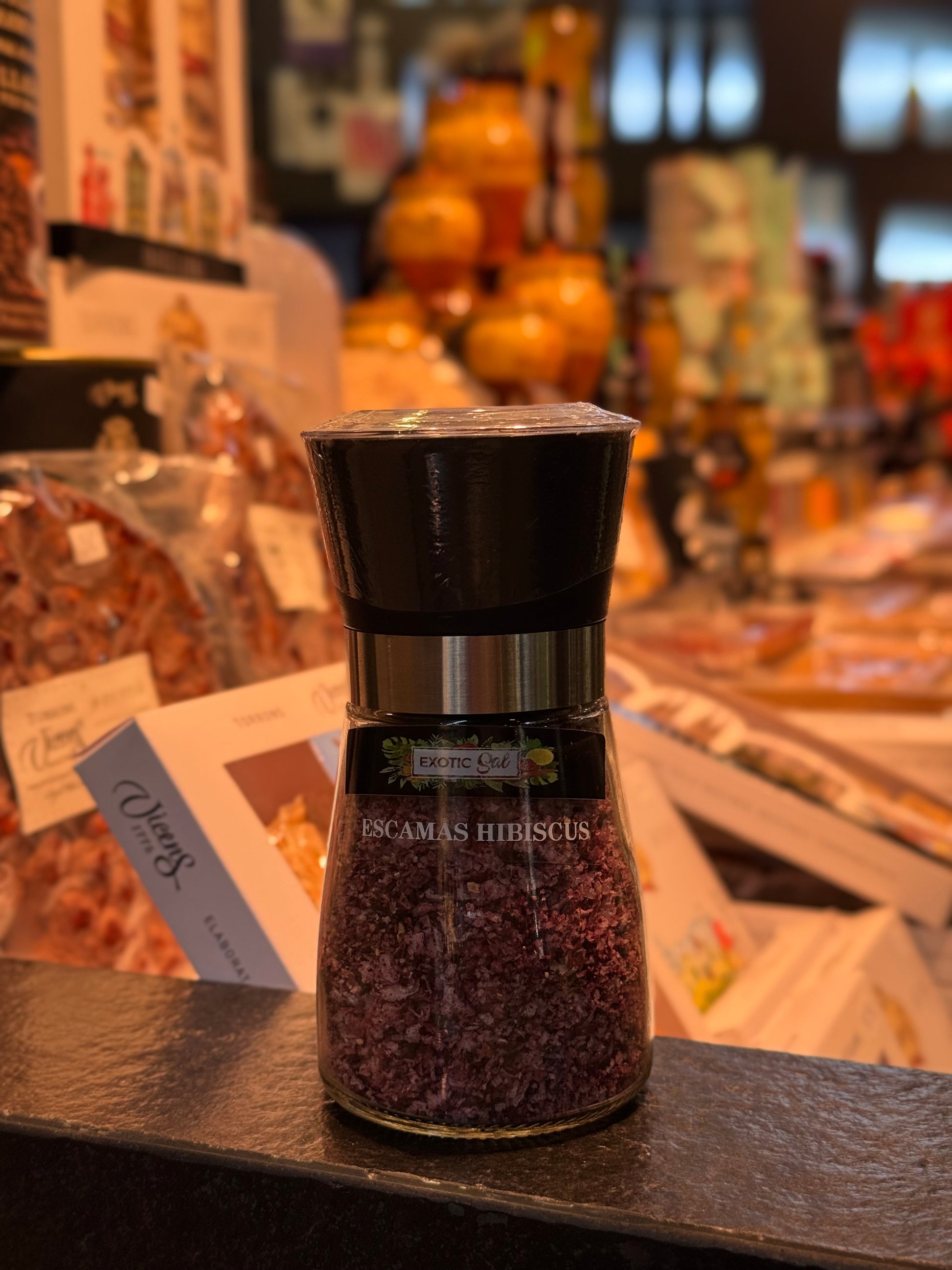 Bote con sazonador de sal de escamas hibiscus en envase recargable de 110g.
